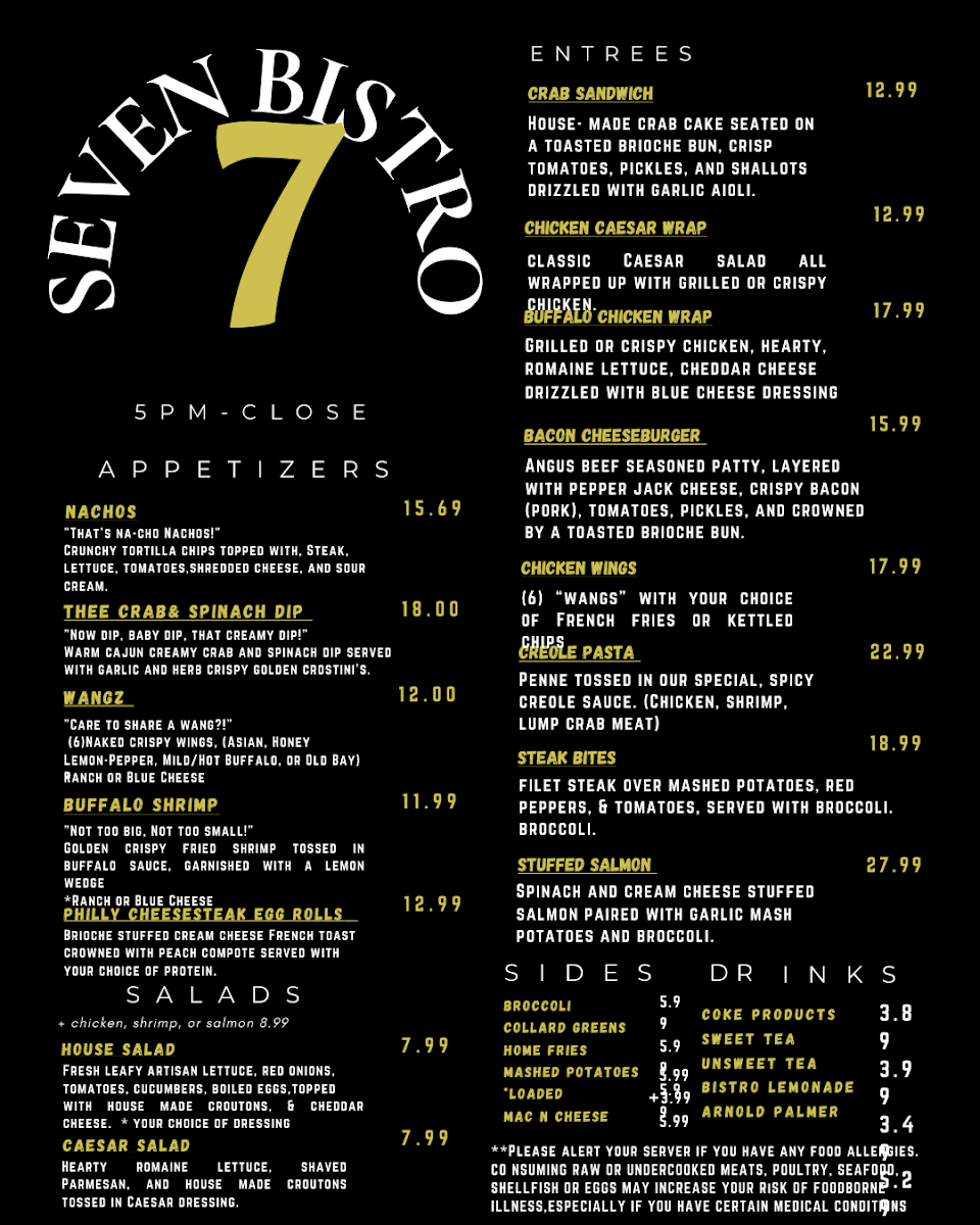 Food lovers will delight in standout options such as the perfectly seasoned Salmon Philly, praised by Tanika Williams for its flawless execution and softness. In addition, the hard-fried catfish with sweet potato fries is a must-try, as noted by Terry TibbsGriffin, who cherishes the restaurant’s attention to detail. With a menu that balances comfort food favorites and creative twists, Seven Bistro ensures every visit is worth repeating.